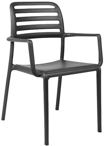 Lignes sobres pour une assise légère, pratique et confortable. Le fauteuil Costa de Nardi est une chaise d’extérieur à accoudoirs et dossier à lattes en résine fibre de verre : il s’agit d’un unique tube annulaire en résine, sans interruptions, aux profilés et aux angles arrondis.